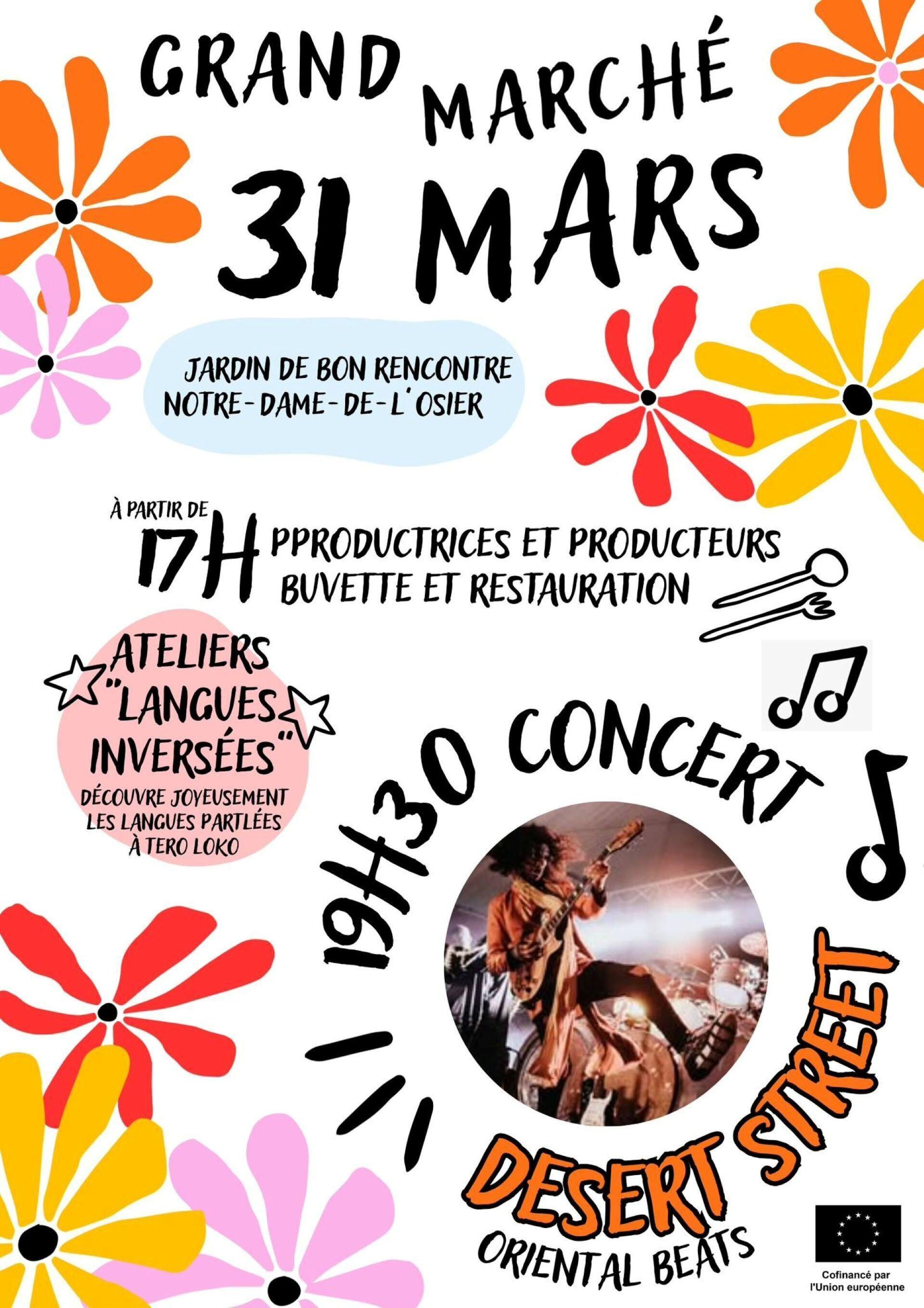 Dès 17h grand marché avec productrices et producteurs locaux, buvette et restauration. Ateliers "Langues inversées" pour découvrir joyeusement les langues parlées à Tero Loko. Concert de Desert Street Oriental Beats à 19h30.
